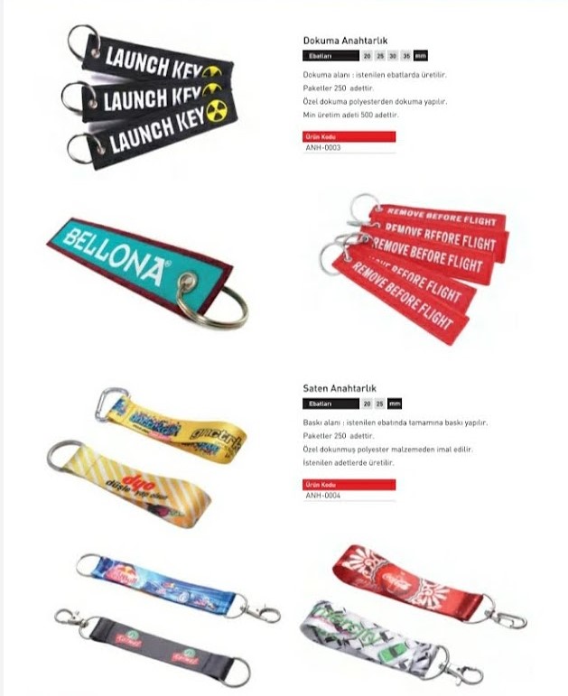 Kumaş anahtarlıklar, hafif ve kullanışlı yapısı ile özellikle etkinliklerde, fuarlarda ve kurumsal tanıtımlarda sıkça tercih edilir. İmalat aşamasında dokuma veya şerit kumaş üzerine serigrafi baskı, transfer baskı veya dijital baskı uygulanabilir. Bu sayede marka logosu veya slogan uzun ömürlü bir şekilde anahtarlık üzerinde kalır.