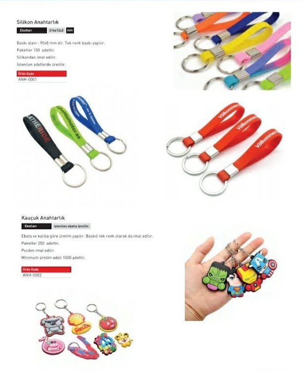 Silikon anahtarlıklar, esnek yapısı, dayanıklılığı ve şık görünümü ile promosyon ürünleri arasında en çok tercih edilen seçeneklerden biridir. Silikon anahtarlık imalatı sırasında farklı renk seçenekleri ve özel kalıplar kullanılabilir. Markalar, logolarını veya kampanya mesajlarını silikon anahtalık üzerine baskı yaptırarak uzun süreli reklam avantajı elde eder.